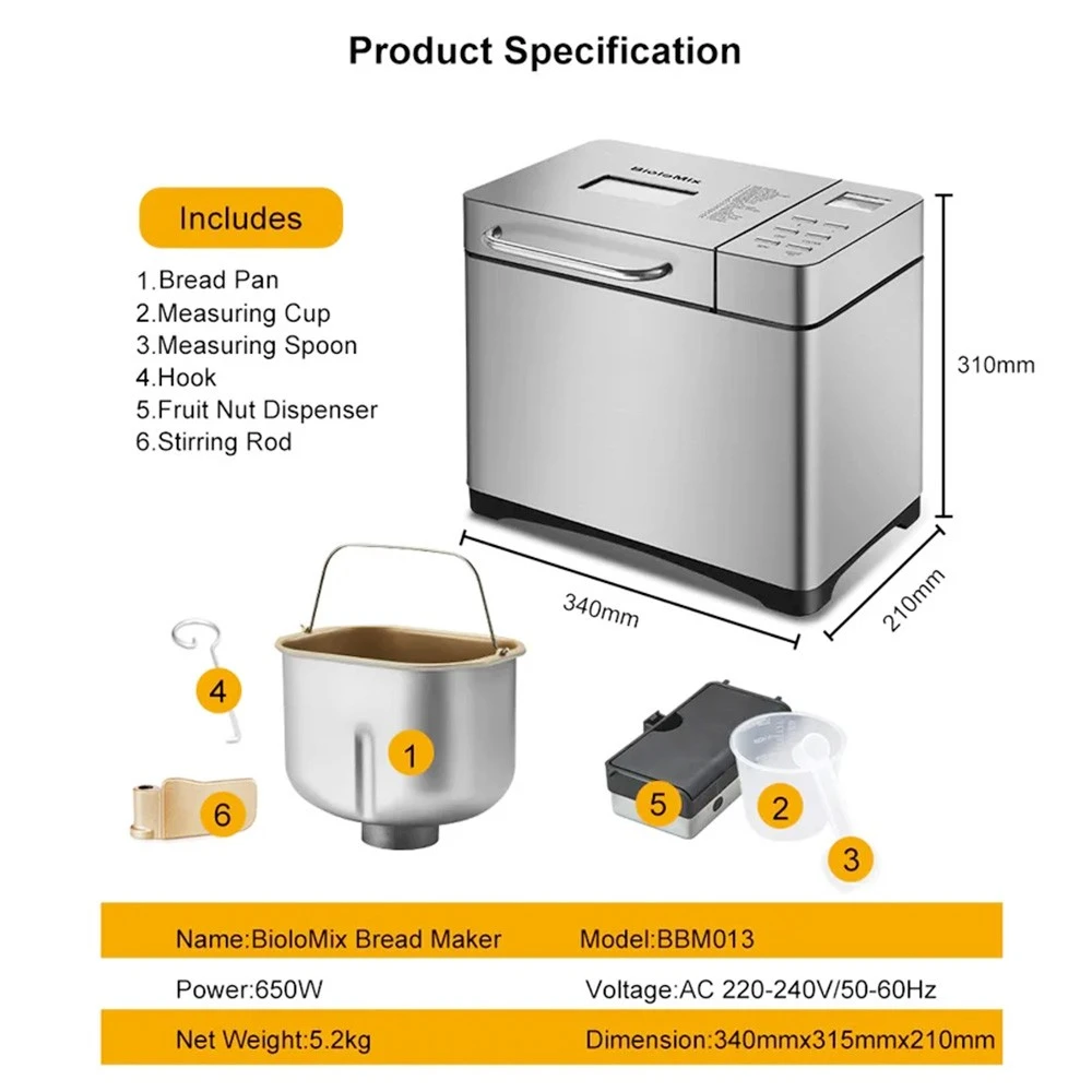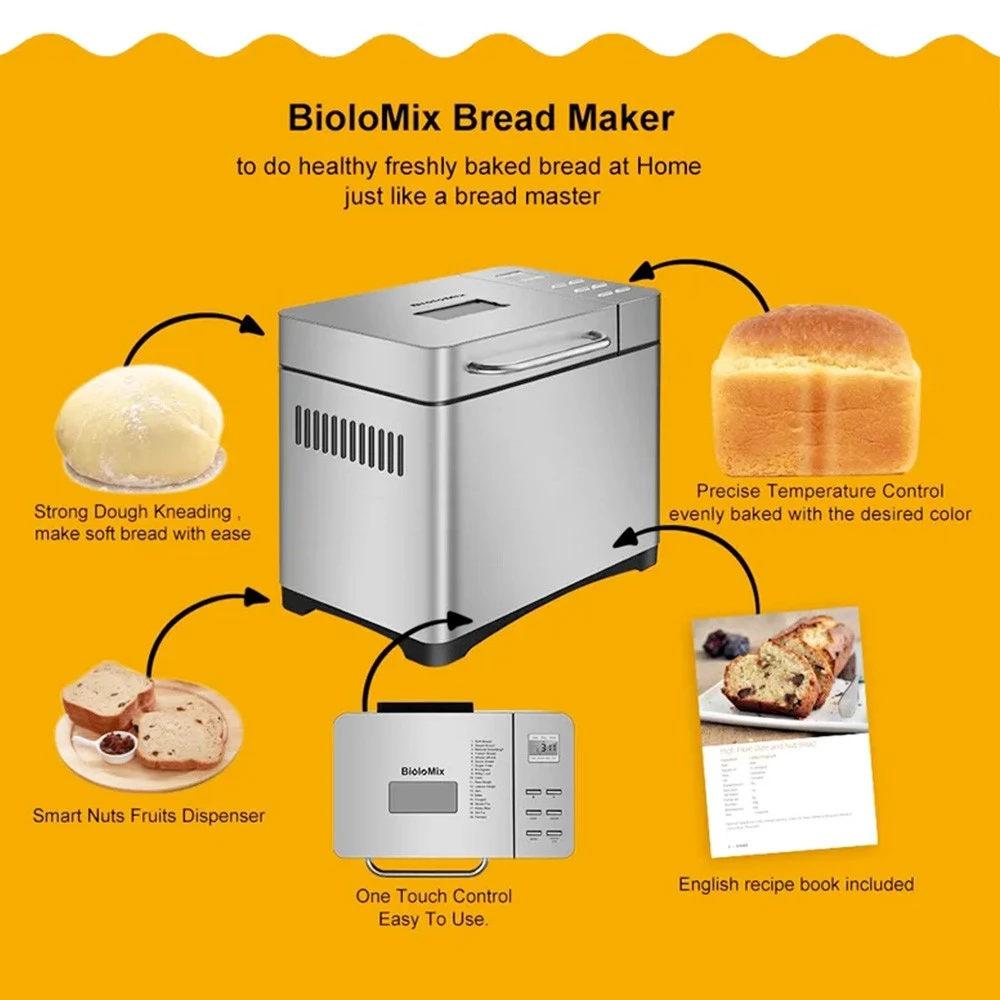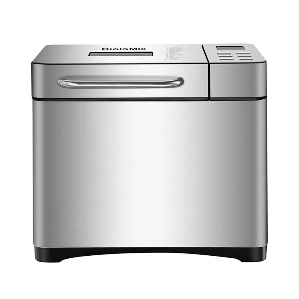 Biolomix BBM013 bread maker has settings for light, medium or dark crusts, and different loaf capacities from 500g, 750g, and 1000g. It also has 19 programs to choose from (quick bread, whole-wheat, gluten-free, jam, etc.)