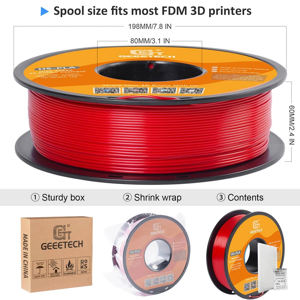 HS-PLA is Geeetech’s latest high-speed printing filament. By adjusting the melting point/index, glass transition temperature of raw materials, and optimizing the production process, Geeetech enables HS-PLA to have stronger fluidity, smoother discharge, faster curing and forming speed, and is not easy to deform under the melting condition.