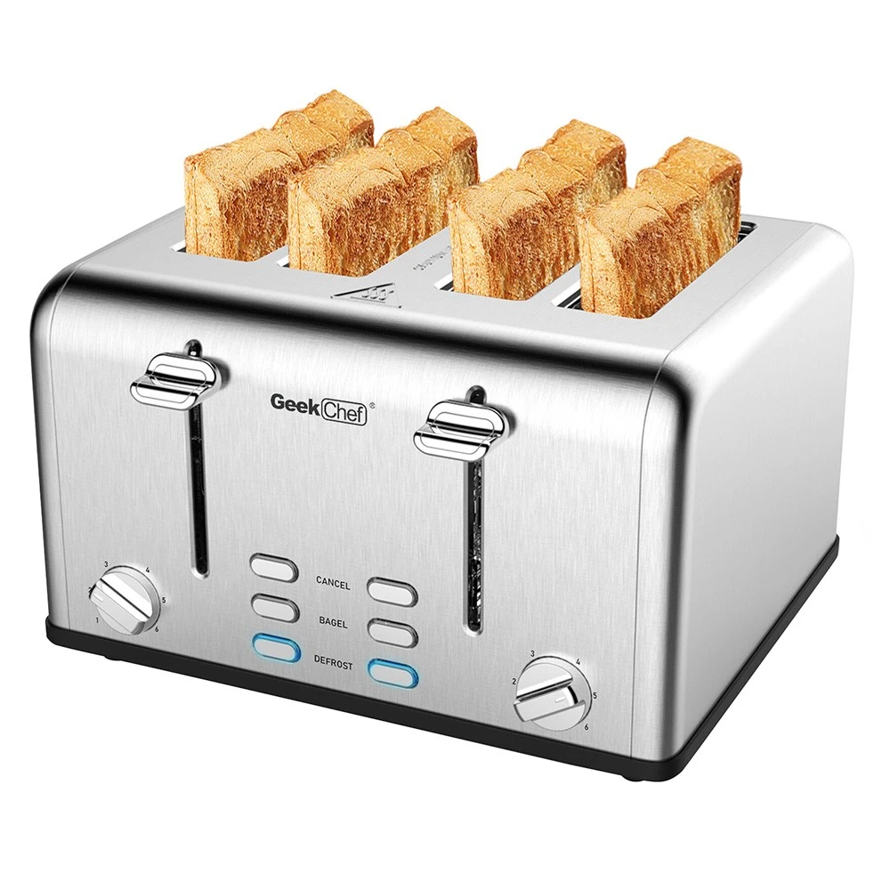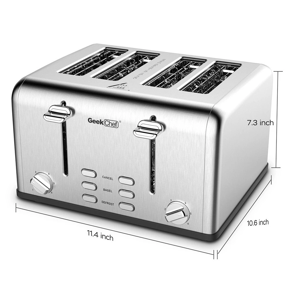 The 4-slice retro toaster can easily handle bagels, English muffins, and other thicker or smaller such as sourdough, tortillas, and Texas toast. Its stainless steel design can avoid being rusted, and food-grade and BPA-free materials could provide better safety for the family.