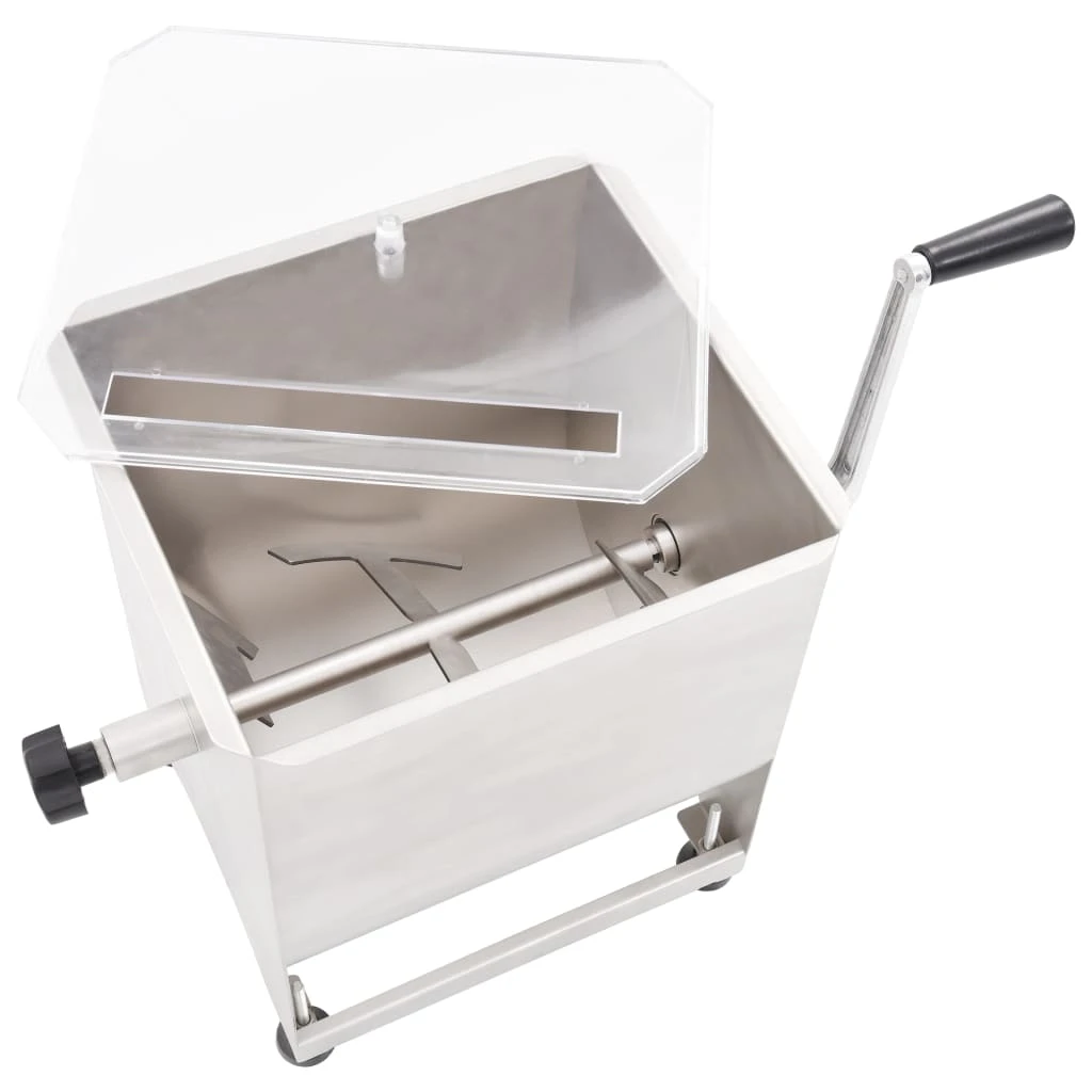 With our easy-to-operate manual meat mixer, you can add your favourite seasonings and spices to your sausage, jerky, and other ground meats by creating your own personalized meat blends at ease. It is perfect for home and professional use. This powerful meat blender has a great capacity of 44 L and it is equipped with a blade shaft that fold the meat into itself to ensure seasoning blends thoroughly and evenly throughout your meat mixture. Large crank handle and clear plastic lid allow you to watch the meat mix while keeping your hands clean and safe from the blades. Made of food-grade stainless steel, the meat blender has a robust and durable construction. Additionally, it is easy to attach to an automatic meat mincer thanks to the gear box, which makes heavy loads possible and enables easy handling even with a full mixer.